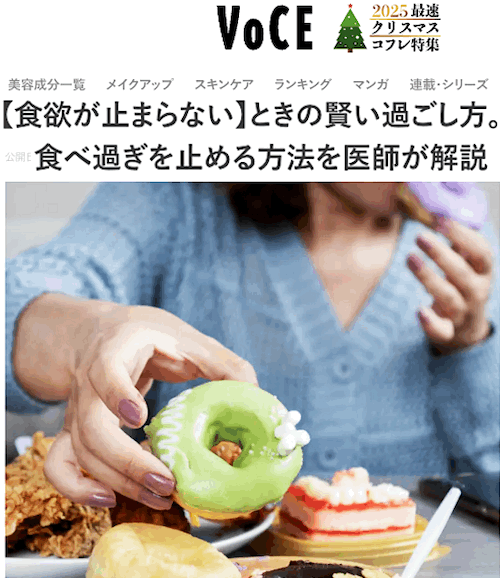 「ホンマでっか!?TV」に出演しました 10月15日(水)放映の「ホンマでっか!?TV」に「予防医学評論家」として出演しました。司会の明石家さんまさんをブラックマヨネーズさん、EXITさん、安藤なつさんらが囲む豪華な顔ぶれです。 収録では現場の熱気とエネルギーに圧倒されつつ、私も大笑いして元気になりました。 VoCEに掲載されました 11/9の女性向け美容雑誌VoCEで、 「【食欲が止まらない】ときの賢い過ごし方。食べ過ぎを止める方法を医師が解説」 というテーマで解説しました。
