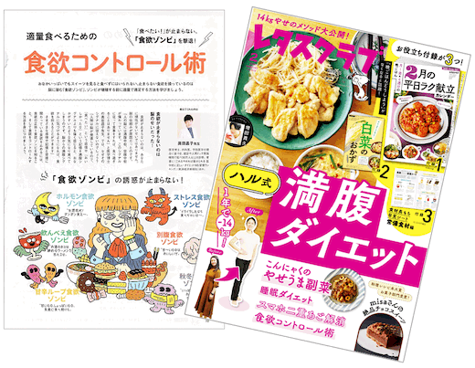 「レタスクラブ」に掲載されました 女性向けライフデザイン誌『レタスクラブ 2月号』(KADOKAWA LifeDesign社)に記事が掲載されました。タイトルは「「食欲ゾンビ」を撃退! 適量食べるための食欲コントロール術」です。 ストレス、飲み会、生理前、寒い時期、食後の別腹。さっき食べたのに、また食べたくなるのはなぜ? そこには医学的な理由があります。正しく知って、食欲をコントロールする方法を身につけましょう。 「健康スイッチ!」に出演しました 東海テレビ「健康スイッチ! ~見つける!防ぐ!予防医療とがんSP~」で予防医療について解説しました。12月25日(木)放映です。「ホンマでっか!?TV」に続いて島崎和歌子さんとご一緒しました。  ©️THK